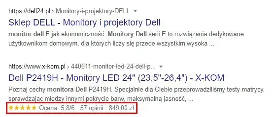 To właśnie dzięki Rich Snippets wyświetlony w SERP-ach możliwy jest nie tylko url, tytuł oraz opis, ale również sekcja z opiniami i ceną. Wydawać może się to szczegółem, jednakże dzięki danym strukturalnym nasz sklep może wyróżnić się z ofertą nad pozycjami konkurencji.