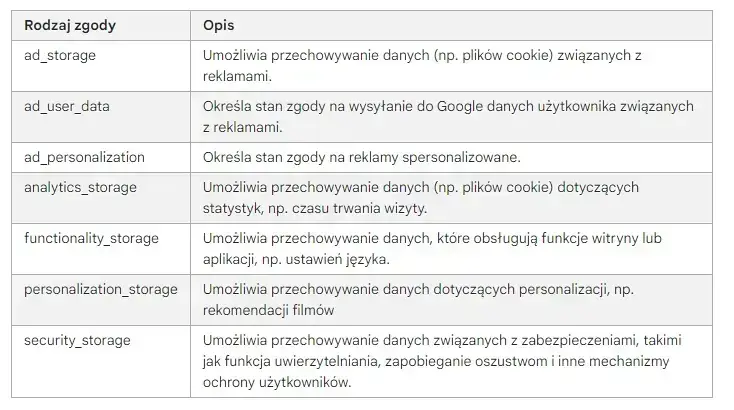 Google Consent Mode zbiera zgody użytkowników w oparciu o kilka parametrów, które w zależności do przyjętej wartości odpowiednio wpływają na działanie tagów Google. W pierwotnej wersji były to następujące parametry: