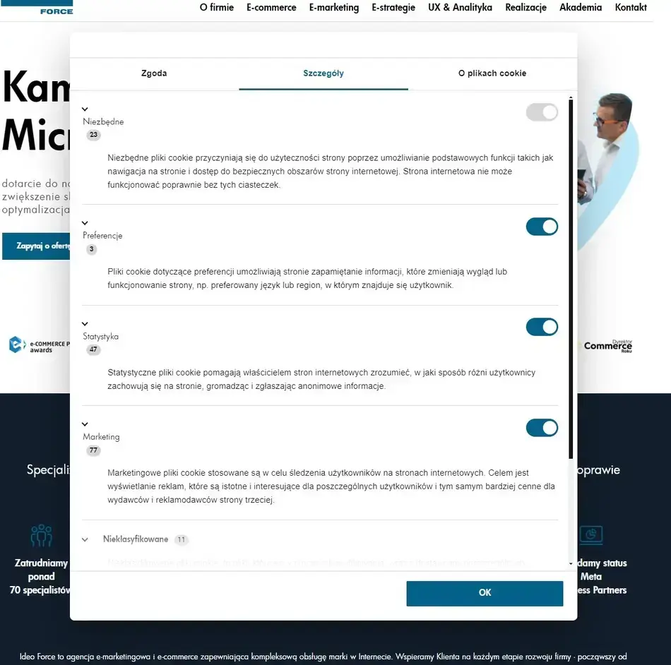Konsekwencją akceptacji poszczególnych zgód jest uruchomienie skryptów rozwiązań przypisanych do wybranych kategorii, a następnie utworzenie przez te skrypty potrzebnych im ciasteczek.