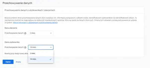 W odróżnieniu od Analytics Universal - GA4 wymaga określenia okresu przechowywania danych. Domyślnie jest to okres 2 miesięcy, jednak samodzielnie możemy wydłużyć ten okres do 14 miesięcy. Najczęściej ten okres nie jest zmieniany i podczas analizy danych mamy dostępne tylko dane z ostatnich 2 miesięcy.
