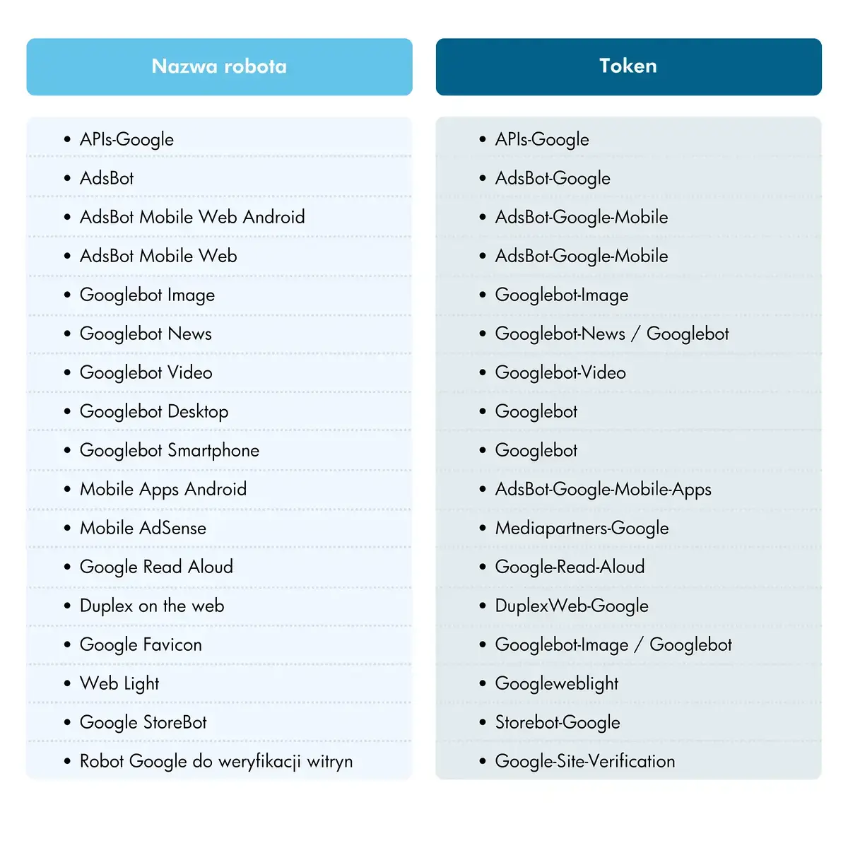 Oficjalnie wyróżnia się 18 różnych rodzajów robotów. Roboty mają przypisane specjalne tokeny, które reprezentują je podczas ustalania reguł indeksowania w pliku robots.txt. Przy ich ustalaniu należy być szczególnie ostrożnym, ponieważ niektóre roboty posiadają te same tokeny, co oznacza, że ustalone reguły mogą dotyczyć kilku robotów. W ten sposób możemy nieumyślnie zablokować przed indeksowaniem więcej robotów, niż pierwotnie zamierzaliśmy.