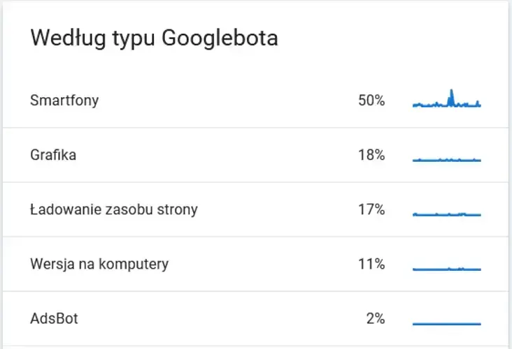 Botem, który zawsze powinien zajmować pierwsze miejsce w statystykach indeksowania naszej strony, jest Googlebot na smartfony. Wynika to z podejścia do projektowania nowoczesnych stron internetowych „mobile first”. Jeżeli większość stron w obrębie witryny jest zaprojektowana zgodnie z tą myślą, znaczna część żądań będzie pochodzić od robota mobilnego. W przeciwnym wypadku należy przeanalizować budowę strony pod kątem możliwych błędów.