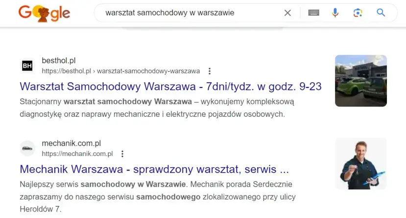 Przykład wyników wyszukiwania w Google dla lokalnej frazy kluczowej "warsztat samochodowy w Warszawie".