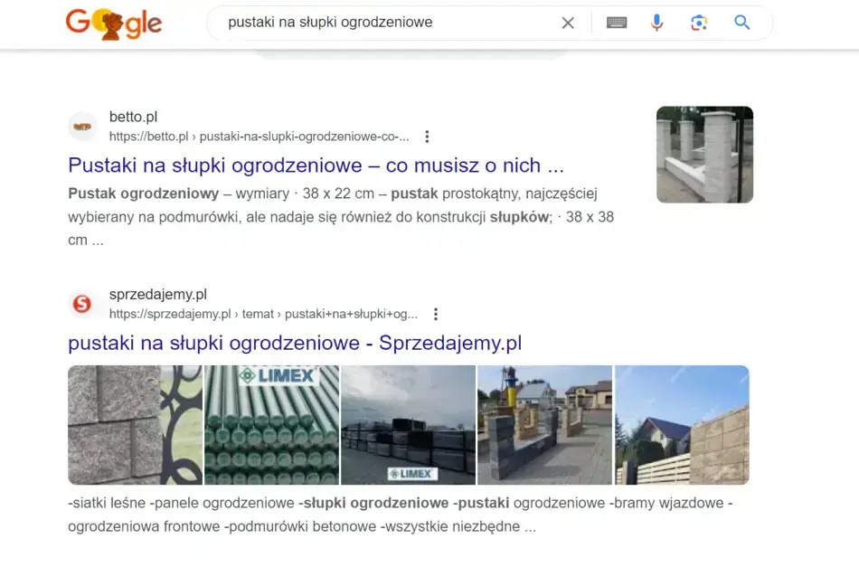 Przykład wyników wyszukiwania w Google dla frazy long tail: "Pustaki na słupki ogrodzeniowe".