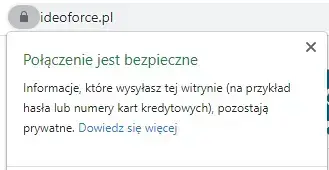 Prawidłowo wdrożony certyfikat SSL oraz protokół HTTPS w wyszukiwarce jest sygnalizowany symbolem zamkniętej kłódki. Po kliknięciu w ten symbol zostaje wyświetlona informacja o bezpieczeństwie witryny.