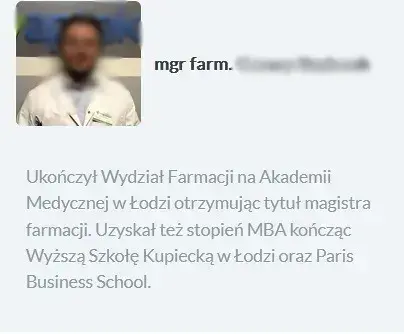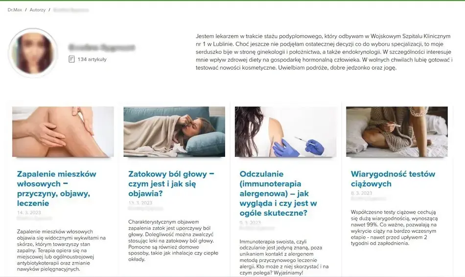 Strony, na których często można spotkać treści medyczne, to m.in. witryny aptek internetowych. Bardzo często w znajdujących się w tym typie witryn tekstach, można znaleźć informacje o autorze tak, jak obrazuje to poniższy przykład.
