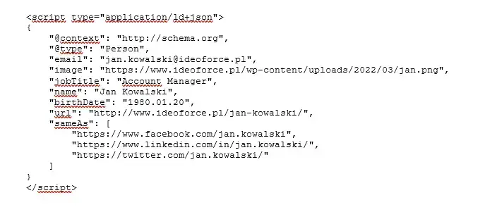 Na stronie autora warto zamieścić odpowiedni fragment schema, w którym znajdzie się jak najwięcej informacji (np. zdjęcie, data urodzenia, zajmowane stanowisko, adres e-mail, czy linki do profili w mediach społecznościowych).