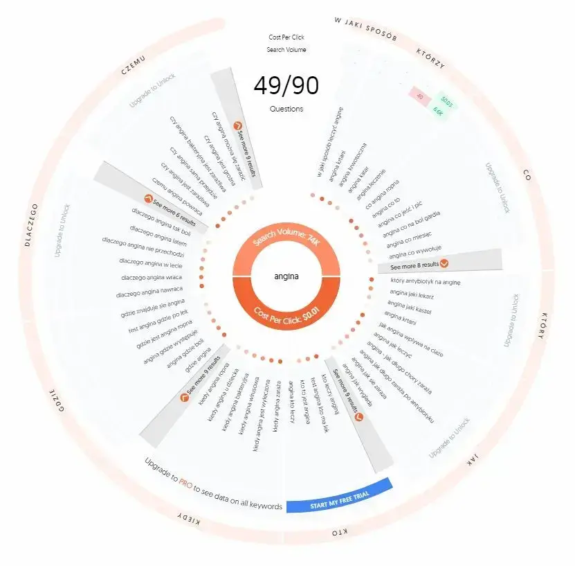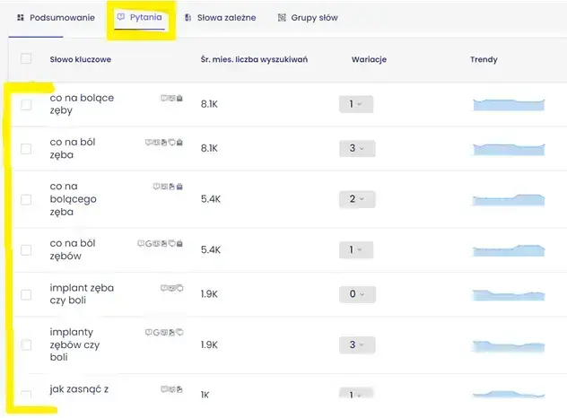 Następnie w sekcji „Pytania” można sprawdzić frazy, które użytkownik wpisuje w wyszukiwarkę, w formie pytań.