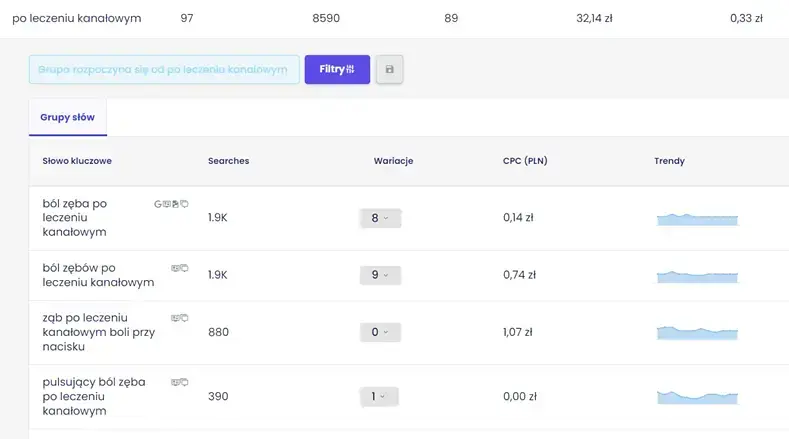 Ostatnia zakładka, którą warto sprawdzić to: „Grupy słów”. Znajdują się tam zestawienia powiązanych ze sobą słów kluczowych, które dotyczą podobnych tematów lub zagadnień. Zakładka ułatwia grupowanie zestawów słów kluczowych w klastry tematyczne. Dzięki temu można sprawdzić, jakie tematy są ważne w danej branży, co ułatwia np. planowanie publikacji na blogu.