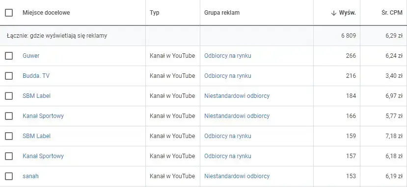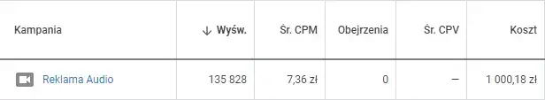Jak już wspominałem, statystyka „Obejrzenia” jest całkowicie nieistotna dla reklamy audio. Jest to spora różnica w stosunku do innych typów reklamy na YouTube, gdzie obejrzenia stanowią jeden z głównych sposobów weryfikacji wyników. W przypadku kampanii audio musimy natomiast skoncentrować się na wyświetleniach i CPM. W czasie naszej próbnej kampanii udało nam się uzyskać CPM równy 7,36 zł. Za pojedyncze wyemitowanie reklamy zapłaciliśmy więc ok. 0,007 zł. Jest to wynik lepszy niż w przypadku większości naszych reklam typu In-Strem i Bumper Adsów, gdzie stawki CPM wahały się w granicach 9-12 zł. Oczywiście wiele zależy tutaj od wybranej grupy docelowej, dla których stawki mogą różnić się dość znacząco. Przypuszczam, że wyniki reklamy mogły być jeszcze lepsze, gdyby naszym targetem byli np. „wszyscy użytkownicy YouTube, którzy mają uszy”.