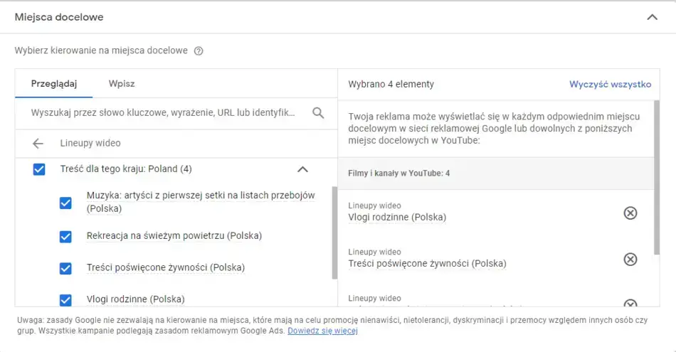 Możliwości jest tutaj sporo i pozwalają one na dotarcie do wyselekcjonowanej grupy osób, których może zainteresować nasza oferta. Nie spotkałem się jednak z żadnymi nowymi możliwościami, które dostępne byłyby wyłącznie dla reklamy audio. Największą nowością są tutaj tzw. Lineupy wideo, pozwalające pokazywać nasze reklamy przy filmach z wyselekcjonowanych, popularnych w danym kraju kategorii. Na chwilę obecną opcje dla naszego kraju nie są jednak szczególnie rozbudowane.