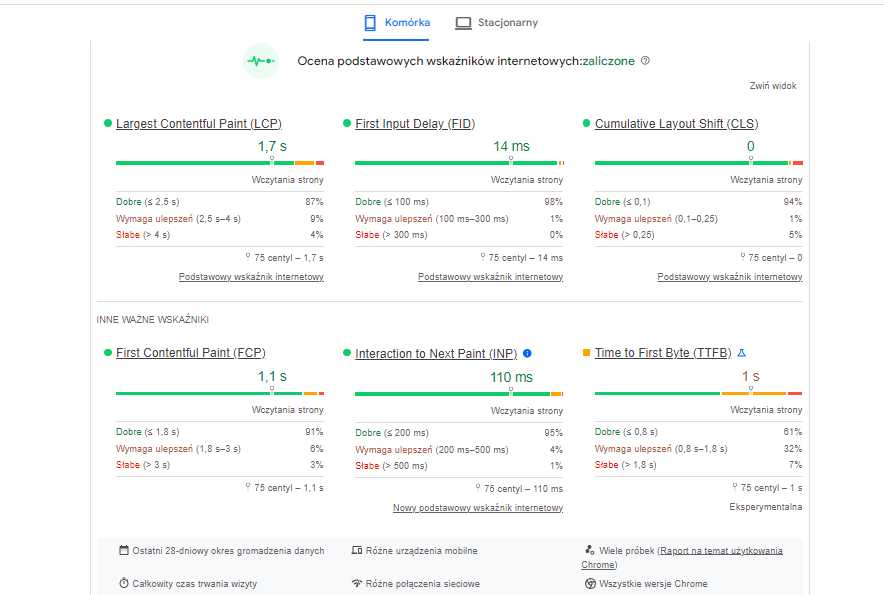 Stąd w górnej części znajdziemy podstawowe wskaźniki internetowe pochodzące z raportu Chrome UX. Oparty jest on na rzeczywistych danych o wydajności, które są zbierane od użytkowników korzystających z przeglądarki Chrome.