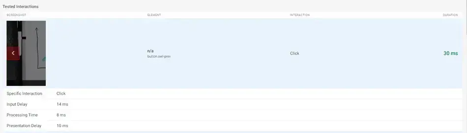 Na załączonym Prt Sc widzimy, że kliknięcie w lewą strzałkę w ramach banneru powoduje opóźnienie wejścia kolejnych elementów slidera (Input Delay) 14 ms, czas przetwarzania wynosi (Processing Time) 8ms, a opóźnienie prezentacji (Presentation Delay) 10 ms. Wartość INP wynosi 30 ms, jest zatem zadawalająca.