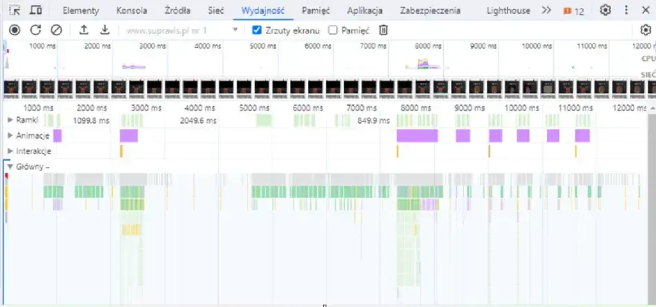 Pierwszy sposób. W ramach zakładki „Wydajność” w Chrome DevTools możemy zarejestrować interakcje użytkownika i dokładnie je przeanalizować:
