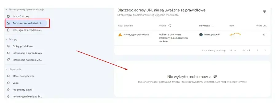 Kiedy posiadamy zweryfikowaną usługę Google Search Console dla naszej domeny lub prefiksu adresu URL, otrzymamy również informacje dotyczące stanu nowego wskaźnika Interaction to Next Paint. W przypadku braku problemów GSC może, ale nie musi, poinformować nas o tym: