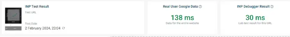 W ramach narzędzia zobaczymy wyniki zarówno dla całej strony internetowej – 138 ms, które pochodzą z Chrome User Experience Report, jak i dla ścieżki adresu URL w ramach domeny. Te informacje mogą się różnić od CrUX – 30 ms. A wszystko dlatego, że każda podstrona w ramach naszej witryny może mieć szybszy lub wolniejszy czas reakcji, jaki jest potrzebny, aby użytkownik mógł wejść w pełną interakcje z umieszczonymi dalej elementami.