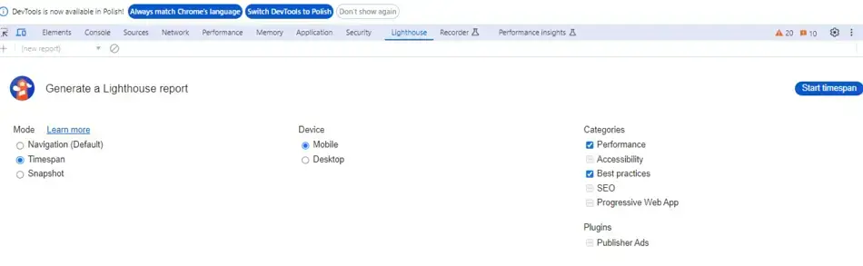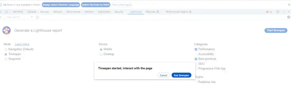 Drugi sposób. Przechodząc do zakładki „Lighthouse”, i klikając w button „Start timespan”: