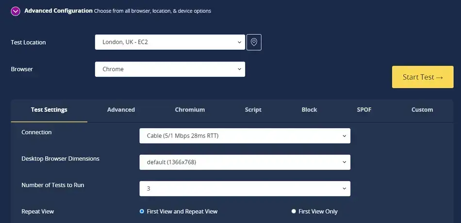 Warto tutaj zauważyć, że WebPageTest udostępnia dokładne opcje konfiguracyjne do testowania stron internetowych. Ważne jest po pierwsze, aby lokalizacja serwera jak najbardziej odpowiadała typowej lokalizacji połączeń. Na przykład, dla angielskiej wersji witryny zalecane jest wybranie serwera w Wielkiej Brytanii, na przykład w Londynie.