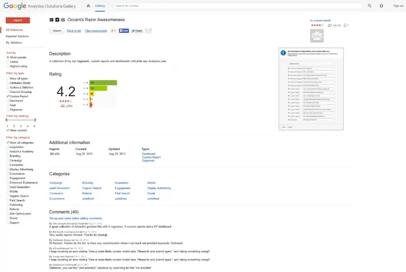 Rozwiązania możemy sortować według popularności, dzięki temu jesteśmy w stanie wybrać te, które cieszą się największym zainteresowaniem innych użytkowników. Będzie to po części pewną wskazówką co do ich przydatności. Dodatkowo możemy sortować według ocen oraz najnowszych. Filtry pomogą nam w wyszukiwaniu rozwiązań według typu np. raporty niestandardowe, kategorii np. e-commerce czy rankingu. Na liście znajdziemy nazwy rozwiązań, ocenę, ilość użytkowników wykorzystujących, krótki opis oraz nazwę twórcy.