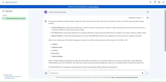 Odpowiedź wygenerowana w bard.google.com na zapytanie „restauracja włoska rzeszów”.