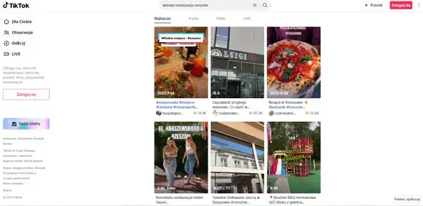 Wyniki wyszukiwania TikTok na lokalne zapytanie: „włoska restauracja rzeszów”.