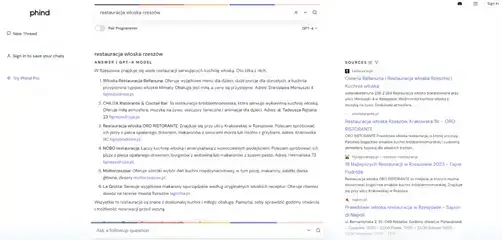 Odpowiedź wygenerowana w phind.com na zapytanie „restauracja włoska rzeszów”.