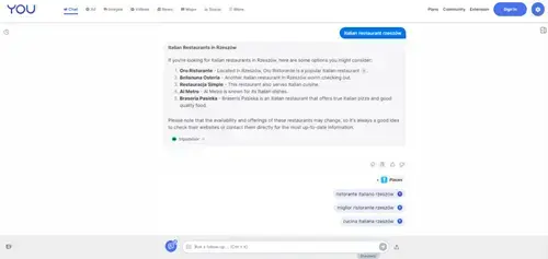 Odpowiedź wygenerowana w you.com na zapytanie: „italian restaurant rzeszów”.