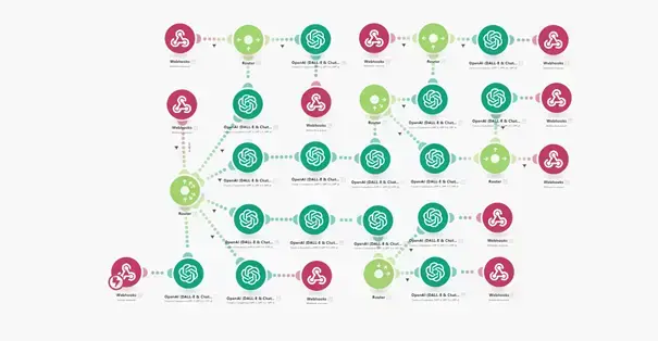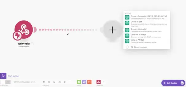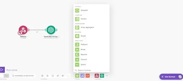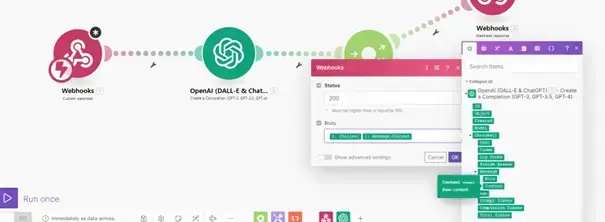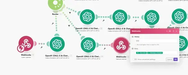 Webhooki tworzą możliwość połączenia scenariusza ze stroną internetową, a Flow Control umożliwia większą kontrolę nad scenariuszem. Chatbot API zostanie wykorzystany do pracy z tekstem i generowania odpowiedzi.