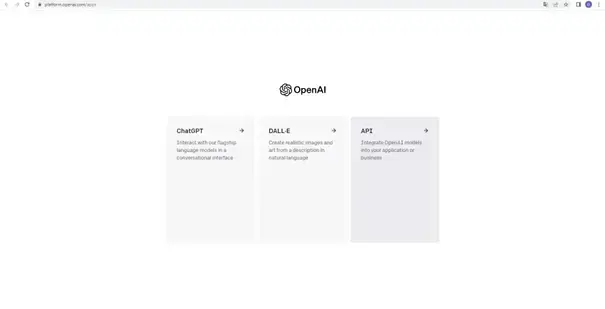 Platforma OpenAI: ekran wyboru usługi, z której użytkownik może skorzystać.