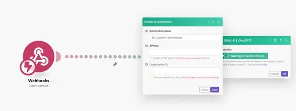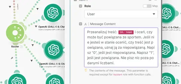 Trzeba wprowadzić klucz dostępu do API oraz identyfikator organizacji na OpenAI. Po połączeniu konta Make z OpenAI można zacząć wprowadzanie poleceń dla chatbota.