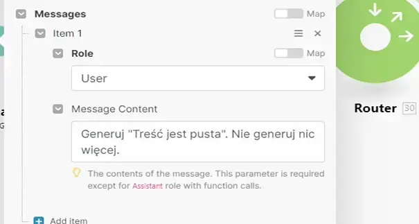 Do usprawnienia działania scenariusza użyjemy Flow Control. Router pozwala z pojedynczej ścieżki utworzyć więcej, co ułatwia filtrowanie i pozwala na generowanie innych odpowiedzi, jeśli treść wpisana przez użytkownika, nie spełnia określonych wymagań.