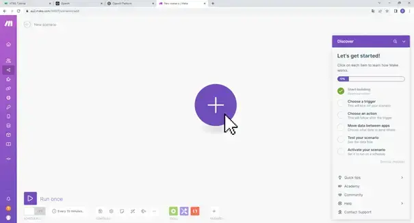 Na początku należy dodać Webhook, który będzie otrzymywał przesyłane informacje. Make zapewnia nowym użytkownikom „samouczek” dostępny w prawym dolnym rogu strony.