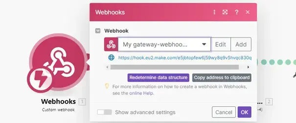 Do scenariusza dodajemy pierwszy Webhook, który będzie uruchamiał scenariusz.