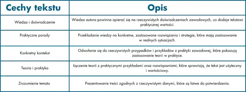 Wiedza i doświadczenie autora to podstawowe składniki, które kształtują jego autorytet w tekście. Ważne jest, aby autor nie tylko znał teorię, ale także potrafił przekazać ją w sposób praktyczny i zrozumiały dla odbiorcy. Kiedy wiedza autora opiera się na rzeczywistych doświadczeniach zawodowych, tekst zyskuje na wartości – staje się nie tylko źródłem teoretycznych informacji, ale także narzędziem, które daje konkretną wartość w postaci rozwiązań praktycznych i sprawdzonych w realnych sytuacjach.