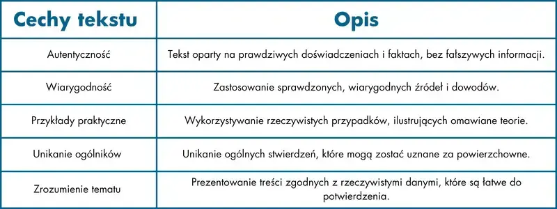 Aby tekst był postrzegany jako wiarygodne źródło informacji, autor powinien unikać ogólników oraz nieprecyzyjnych stwierdzeń, które mogą zostać odebrane jako puste frazy. Wartość merytoryczna tekstu leży w szczegółach – im bardziej konkretne i oparte na faktach będą przedstawiane tezy, tym większy wpływ będą miały na odbiorcę. Teksty, które ograniczają się do ogólnych stwierdzeń, jak "nowoczesne technologie zrewolucjonizowały branżę", pozostawiają za sobą wrażenie powierzchowności i brak autentyczności.