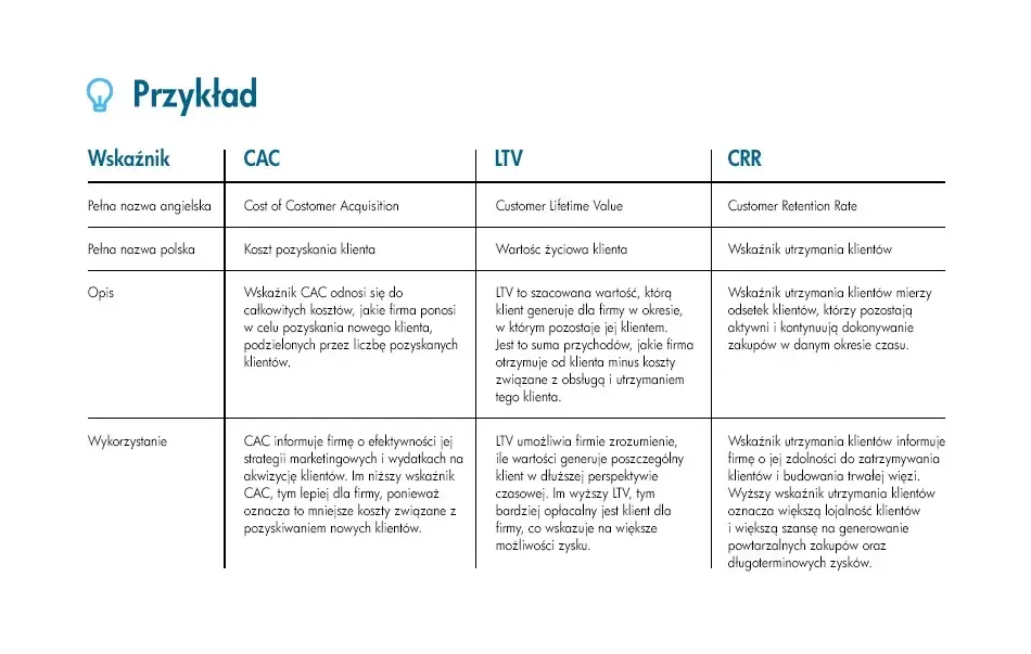 Wskaźnik CAC (koszt pozyskania klienta), LTV (wartość klienta na przestrzeni życia) oraz wskaźnik utrzymania klientów (Customer Retention Rate) są kluczowymi miarami używanymi w analizie biznesowej, zwłaszcza w kontekście e-commerce.