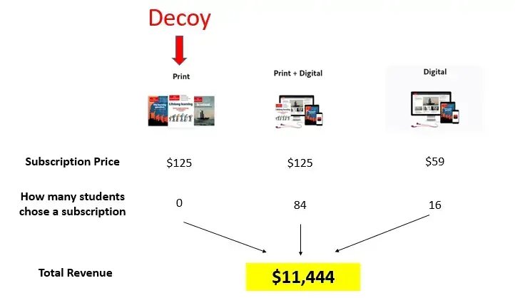 Teraz większość studentów wybierała opcję drugą, czyli elektroniczna i drukowaną wersję magazynu za 125 dolarów. W efekcie zastosowania wabika przychody mogłyby wzrosnąć o prawie trzy i pół tysiąca dolarów.