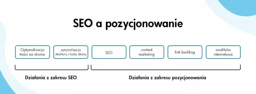 Do działań SEO zalicza się optymalizację struktury i kodu strony oraz treści, które się na niej znajdują. Pozycjonowanie to natomiast proces obejmujący zarówno działania SEO, jak i content marketing, link building oraz analitykę internetową.