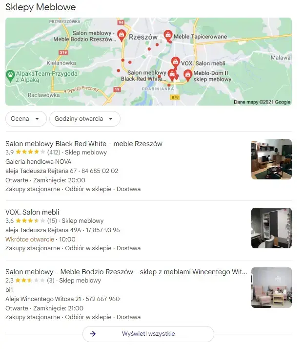 Zrzut ekranu przedstawiający profile Google Moja Firma w wyszukiwarce Google po wpisaniu konkretnej frazy.