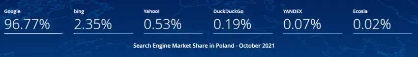 Całkowity udział wyszukiwarek w rynku, źródło: https://gs.statcounter.com/search-engine-market-share/all/poland.