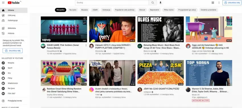Zrzut ekranu przedstawiający stronę główną serwisu YouTube.pl.