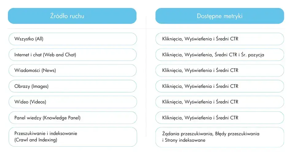 W zależności od wybranego źródła ruchu (jest ich 7), są dostępne następujące metryki: