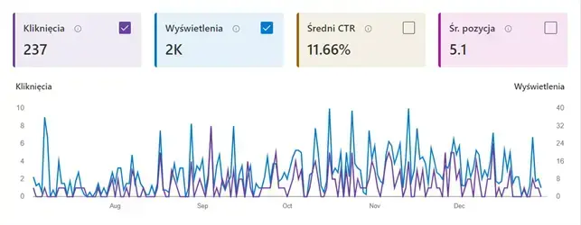 Jednym z najważniejszych raportów, na który warto zwrócić uwagę podczas oceny widoczności strony w wynikach wyszukiwania Bing jest Search performance.