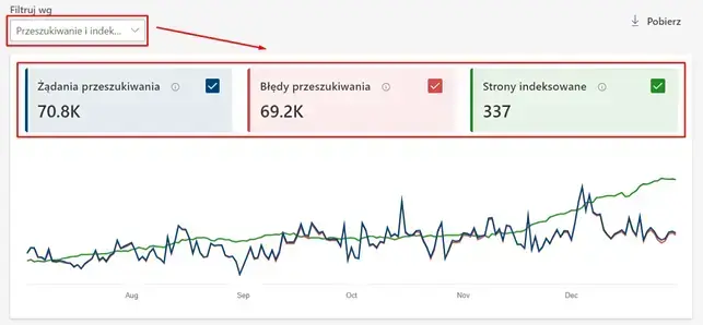 Analizując widoczność strony warto wziąć pod uwagę na statystyki dotyczące podstron zaindeksowanych przez Bing. Większa liczba zaindeksowanych stron może potencjalnie prowadzić do zwiększenia widoczności w wynikach wyszukiwania. Jeśli w raporcie liczba zaindeksowanych podstron odbiega od liczby podstron, które według nas powinny znajdować się w indeksie, może być konieczne sprawdzenie strony pod kątem problemów uniemożliwiających prawidłowe przeszukiwanie i indeksowanie stron przez usługę Bing.