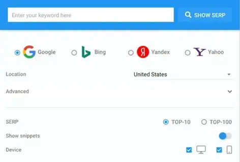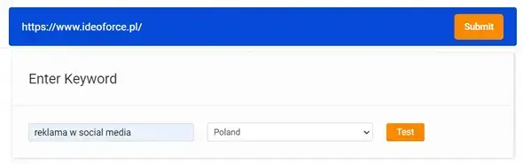 To darmowe narzędzie, które pozwala użytkownikom sprawdzenie pozycji strony w wynikach wyszukiwania dla wybranego słowa kluczowego. Narzędzie jest bardzo proste i intuicyjne w użyciu, a analiza zajmuje zaledwie kilka minut. W pierwszym kroku należy podać adres witryny i monitorowaną frazę, a następnie wskazać kraj, który nas interesuje.