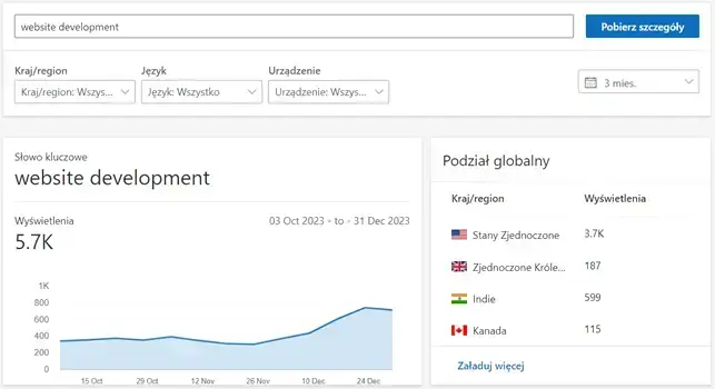 Kolejnym raportem, któremu warto się przyjrzeć jest Keyword research. Narzędzie do badania słów kluczowych zostało stworzone, aby pomóc webmasterom dowiedzieć się czego szukają użytkownicy. Po wpisaniu wybranego słowa kluczowego zobaczymy wiele ciekawych informacji. Raport przestawia dane o liczbie wyszukiwań z podziałem na kraje, powiązane słowa kluczowe, panujące trendy oraz TOP10 wyników wyszukiwania dla danego zapytania.