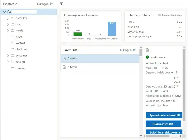 W sekcji Site explorer przedstawione są wszystkie niezbędne informacje na temat podstron serwisu. Co ciekawe, raport ten odzwierciedla strukturę adresów URL analizowanej witryny. Eksplorator witryn jest połączony z raportem Wydajność wyszukiwania, dlatego obok każdego adresu URL widzimy podstawowe dane na temat widoczności w organicznych wynikach wyszukiwania.