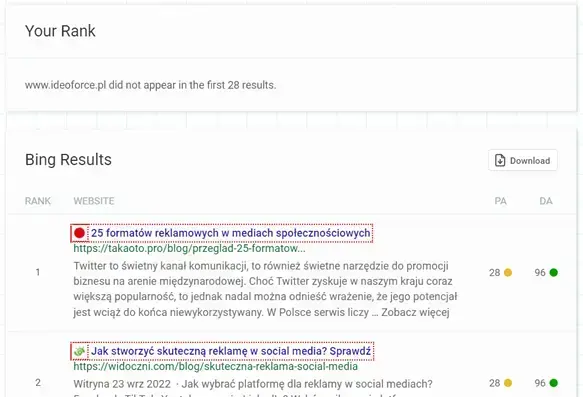 W wyniku otrzymamy informacje o pozycji analizowanej strony i wgląd do wyników wyszukiwania z możliwością pobrania tych danych w formie pliku Excel.