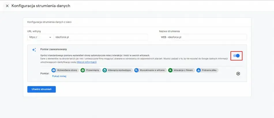 Wpisz adres URL swojej witryny oraz nawę strumienia. Podobnie jak przy tworzeniu usługi tutaj również warto stosować odpowiednie nazewnictwo, które pozwoli na szybką identyfikację rodzaju platformy. Włącz pomiar zaawansowany i utwórz strumień.