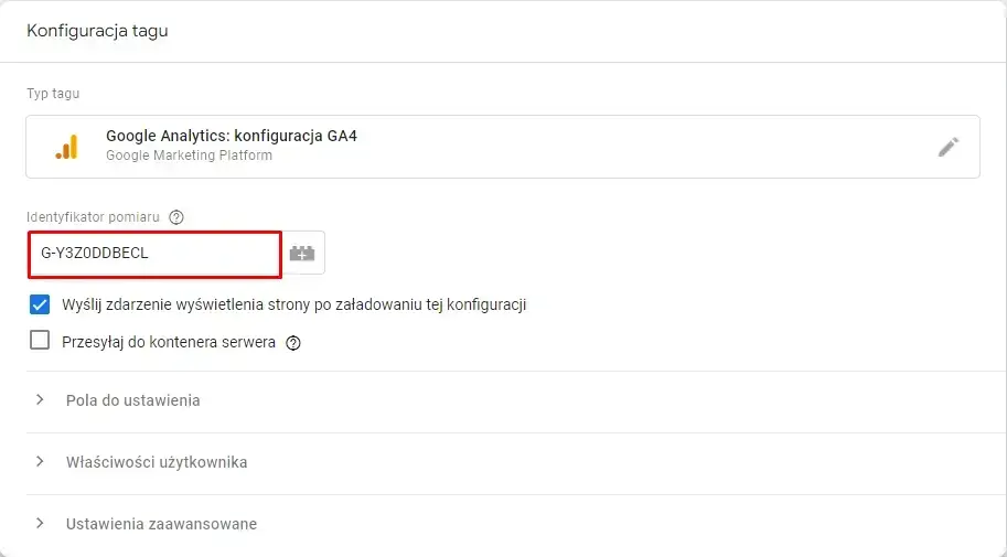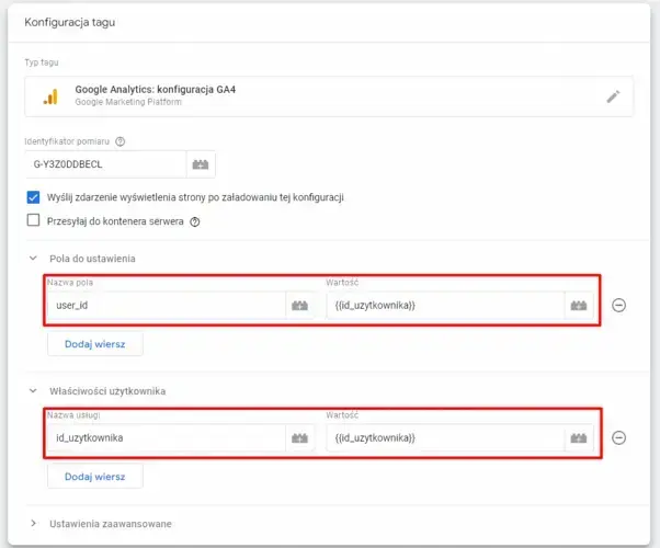 Jeśli na Twojej stronie istnieje możliwość logowania, prześlij do GA4 identyfikator użytkownika. Najłatwiej pozyskać go z warstwy danych wcześniej przygotowanej przez programistę. W tym celu stwórz odpowiednią zmienną warstwy danych, następnie rozwiń sekcję „Pola do ustawienia”. W nazwę pola wpisz „user_id”, a w wartości umieść stworzoną wcześniej zmienną. Pozwoli to GA4 dopasować zdarzenia do konkretnego użytkownika, ten zabieg jest szczególnie istotny, jeśli śledzisz ruch w wielu platformach. Aby uzyskać dostęp do identyfikatora w raportach i eksploracjach rozwiń sekcję „Właściwości użytkownika”. Tym razem nie wpisuj jednak „user_id”, gdyż jest to nazwa zastrzeżona. Użyj innego parametru np. „id_uzytkownika”. Jako wartość ponownie wstaw zmienną warstwy danych. Zapisz.